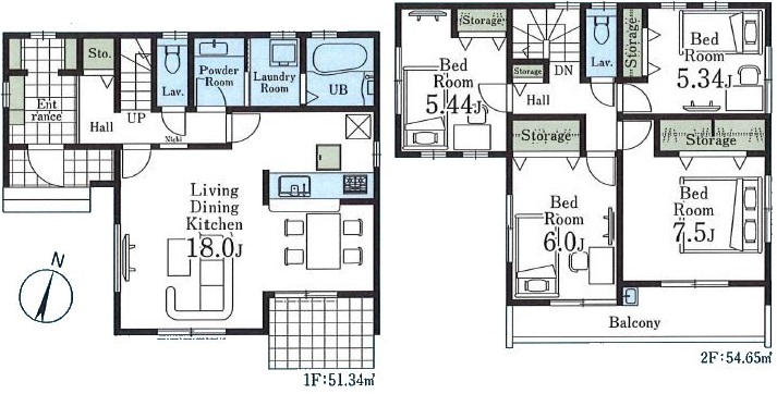 間取詳細 | (1階)LDK18.0、(2階)洋7.5、(2階)洋6.0、(2階)洋5.44、(2階)洋5.34 |