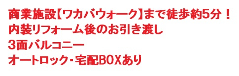 | 特色 | エレベータ、オートロック、ペット飼育可(細則有)、角部屋、二階以上、宅配ボックス、駐車場(空状況要確認4,000円~9,000円/月)、都市ガス、リフォーム、空室 |