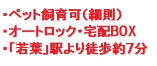 | 特色 | エレベータ、オートロック、ペット飼育可(細則有)、二階以上、宅配ボックス、駐車場(空状況要確認5,000円~9,000円/月)、都市ガス、空室、口座振替手数料88円 |