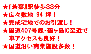 東武東上線『若葉』駅徒歩33分!広々敷地94坪!鶴ヶ島第一小学校・鶴ヶ島中学校エリア!国道407号線・鶴ヶ島IC至近で車アクセス良好!国道沿いには商業施設多数!建築条件ございませんので、お好きなハウスメーカーにて建築できます!