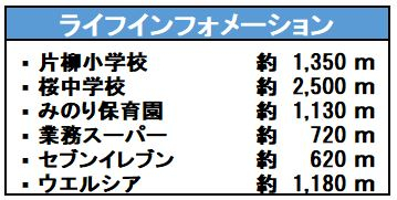 | 学区 | 小学校区:片柳小学校 1,350m 中学校区:桜中学校 2,500m |