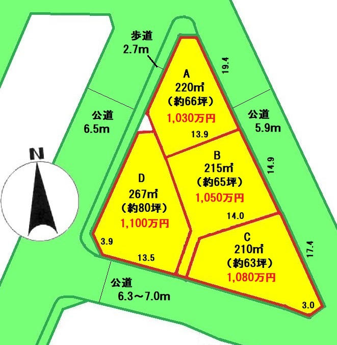 | 接道 | 北西 6.5m(幅員) 公道 北東 5.9m(幅員) 公道 19.4m(接面) |