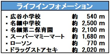| 学区 | 小学校区:広谷小学校 540m 中学校区:名細中学校 2,500m |