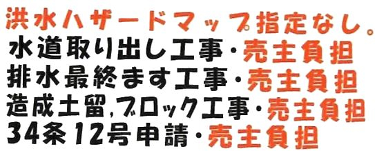 建築条件なし、調整34条12号、角地、公営水道、浄化槽、排水(道路側溝)、プロパンガス、電気、農地転用・開発許可が必要です、完成宅地でのお引渡し、水害ハザードマップ:該当なし
