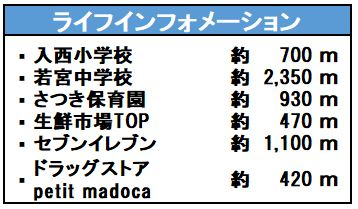 | 学区 | 小学校区:入西小学校 700m 中学校区:若宮中学校 2,350m  |
