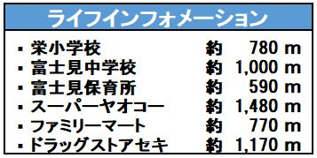| 学区 | 小学校区:栄小学校 780m 中学校区:富士見中学校 1,000m |