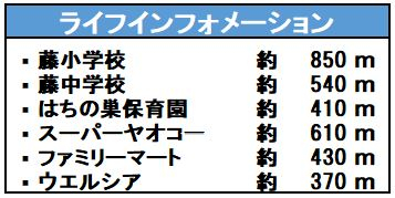 | 学区 | 小学校区:藤小学校 850m 中学校区:藤中学校 540m |