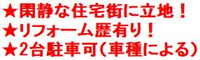 閑静な住宅街に立地!リフォーム歴有!2台駐車可(車種による)