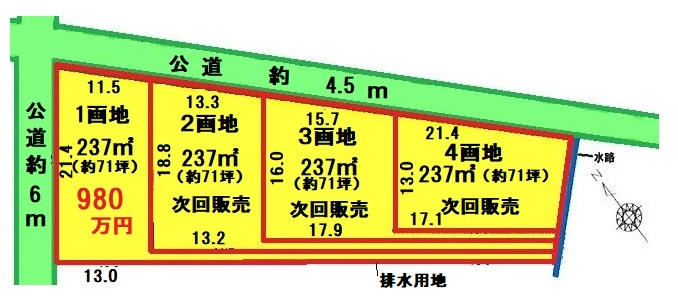 接道 | 北 4.5m(幅員) 公道 11.5m(接面) 西 6m(幅員) 公道 21.4m(接面) |