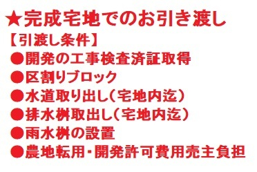 建築条件なし、調整34条12号、角地、公営水道・個別浄化槽、プロパンガス、農地転用・開発許可が必要です、完成宅地でのお引渡し、水害ハザードマップ:3.0~5.0m未満、ナビ:2855-4付近