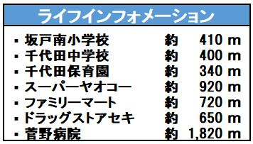 | 学区 | 小学校区:坂戸南小学校 410m 中学校区:千代田中学校 400m |