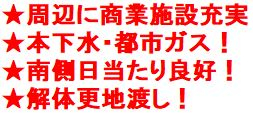 建築条件なし、公営水道、公共本下水、都市ガス、解体更地渡し、位置指定持分無(通行承諾書有)、確定測量済、水害ハザードマップ:該当なし