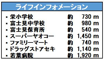 | 学区 | 小学校区:栄小学校 730m 中学校区:富士見中学校 980m |