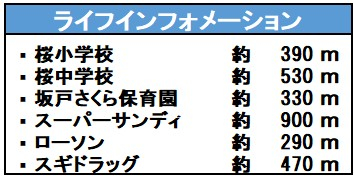 | 学区 | 小学校区:桜小学校 390m 中学校区:桜中学校 530m |