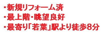 エレベータ、ペット飼育可(小鳥・観賞用魚以外不可)、二階以上、最上階、都市ガス、リフォーム、空室、自転車置場100円/月、バイク置場200~300円/月、告知事項あり