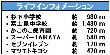 | 学区 | 小学校区:杉下小学校 930m 中学校区:富士見中学校 1,430m |
