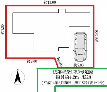 | 接道 | 南 4.2m(幅員) 私道 5m(接面) |