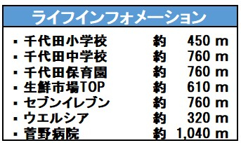 | 学区 | 小学校区:千代田小学校 450m 中学校区:千代田中学校 760m |