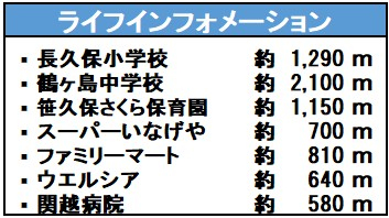 | 学区 | 小学校区:長久保小学校 1,290m 中学校区:鶴ヶ島中学校 2,100m |