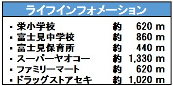 | 学区 | 小学校区:栄小学校 620m 中学校区:富士見中学校 860m |