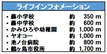 | 学区 | 小学校区:藤小学校 350m 中学校区:藤中学校 600m |
