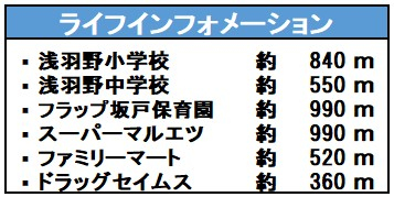 | 学区 | 小学校区:浅羽野小学校 840m 中学校区:浅羽野中学校 550m |