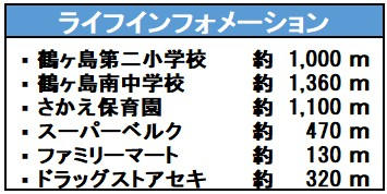 | 学区 | 小学校区:鶴ヶ島第二小学校 1,000m 中学校区:鶴ヶ島南中学校 1,360m |