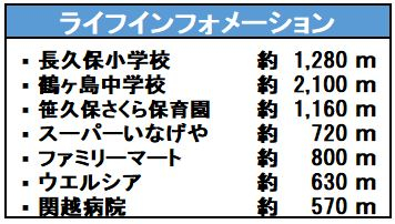 | 交通 | 坂戸駅まで 徒歩16分 | 学区 | 小学校区:長久保小学校 1280m 中学校区:鶴ヶ島中学校 2100m |