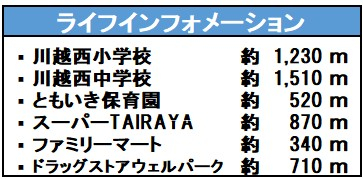 学区 | 小学校区:川越西小学校 1230m 中学校区:川越西中学校 1510m |
