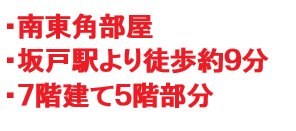 | 特色 | エレベータ、オートロック、二階以上、角部屋、都市ガス | |||||||||||||||||