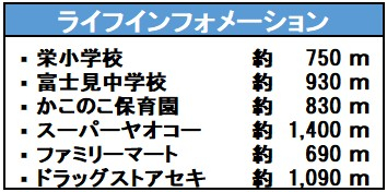 学区 | 小学校区:栄小学校 750m 中学校区:富士見中学校 930m |